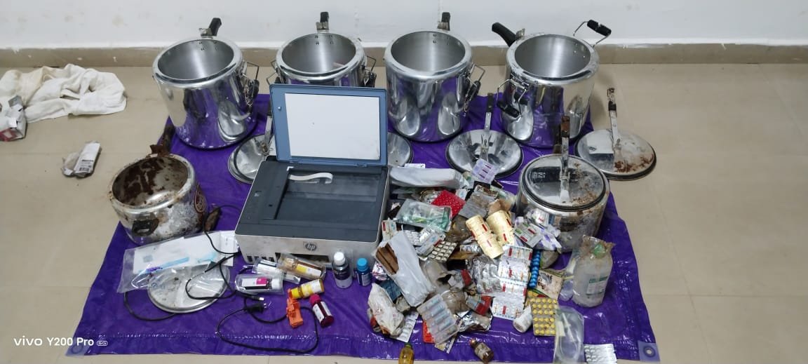 सर्चिंग के दौरान पुलिस पार्टी को जंगल के भीतर छुपाकर रखे गए 06 नग कुकर, नक्सली पोस्टर बनाने में उपयोगी 01 नग रंगीन प्रिंटर, विभिन्न प्रकार के मेडिकल डिवाइस, इंजेक्शन, कॉटन बैंडेज, इंजेक्शन शीशी, एवं विस्फोटक बनाने में प्रयुक्त सामग्री बरामद हुई। यह सामग्री नक्सलियों की विध्वंसक गतिविधियों के लिए तैयार की गई थी।